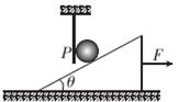 4、填空题  (3分)如图所示,用固定挡板P将质量为m的小球挡在光滑斜面上处于静止状态.已知斜面体的质量为M,倾角为θ,斜面体与水平面间的动摩擦因数为μ,重力加速度为g.为使小球能做自由落体运动到地面,向右拉动斜面体的水平恒力F至少为?