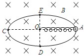 ?m/s。(保留三位有效数字)2、选择题  如图所示,竖直平面内有一固定的光滑绝缘椭圆大环,轻弹簧一端固定在大环的中心O,另一端连接一个可视为质点的带正电的小环,小环刚好套在大环上,整个装置处在一个水平向里的匀强磁场中.将小环从A点由静止释放,已知小环在A、D两点时弹簧的形变量大小相等.则