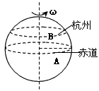 4、选择题 在赤道的物体A和在杭州的物体B随地球自转而做匀速圆周运动,如图所示,它们的线速度分别为vA、vB,周期分别为TA、TB,则( ? )
