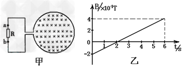 5、计算题  如图(甲)所示,一个电阻值为1Ω,匝数为100匝,面积为0.1m2的圆形金属线圈与阻值为3Ω的电阻R连结成闭合电路。在线圈中的圆形区域内存在着垂直于线圈平面的匀强磁场,规定垂直线圈平面向里的磁场为正,磁场的磁感强度随时间t变化的关系图线如图(乙)所示。求通过电阻R上的电流大小和方向。