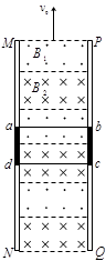 1、计算题 如图所示是磁动力电梯示意图,即在竖直平面内有两根很长的平行竖直轨道,轨道间有垂直轨道平面交替排列的匀强磁场和
