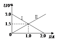 本题解析:由图线I可知电源电动势为3V,短路电流为2A,电源内阻为1.5Ω,由图线II可知电阻R阻值为1.5Ω,交点表示电源与电阻串联后,电阻R来那个短电压为1.5V,电流为1A,此时电源输出功率为总功率的0.5倍,内电路功率等于外电路功率,AD正确