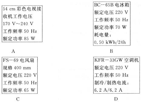 本题解析:(1)显然正常工作时电视机功率为85 W,电冰箱的功率为70 W,电风扇的功率为65 W,空调机的功率为P=U·I="1" 364 W,因此,功率最大的是空调机.