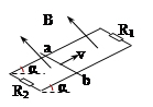 5、选择题 如图所示,平行金属导轨与水平面成α角,导轨与固定电阻R1和R2相连,匀强磁场垂直穿过导轨平面。有一质量为m的导体棒ab,其电阻与R1和R2的阻值均相等,与导轨之间的动摩擦因数均为μ,导体棒ab沿导轨向上运动,当其速度为v时,受到的安培力大小为F。此时