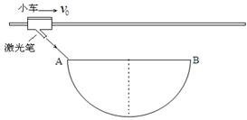 2、计算题 )一半径为R的半圆柱玻璃体,上方有平行截面直径AB的固定直轨道,轨道上有一小车,车上固定一与轨道成45°的激光笔,发出的细激光束始终在与横截面平行的某一平面上,打开激光笔,并使小车从左侧足够远的地方以
