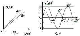 (2)两个同学利用假期分别去参观北京大学和香港大学的物理实验室,各自在那里利用先进的DIS系统较准确地探究了“单摆的周期T与摆长L的关系”,它们通过校园网交换实验数据,并由计算机绘制了T2~L图象,如图甲所示。在北京大学的同学所测实验结果对应的图线是________(选填“A”或“B”)。另外,在香港大学的同学绘制了在同一地点做的两种单摆的振动图象,如图乙所示,则两单摆摆长之比=__________。