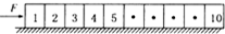 4、选择题 如图所示,质量形状均相同的木块紧靠在一起,放在光滑的水平面上,现用水平恒力F推1号木块,使10个木块一起向右匀加速运动,则第8号对第9号木块的推力为( )