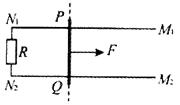 2、计算题 如图所示,M1N1N2M2是位于光滑水平桌面上的刚性U型金属导轨,导轨中接有阻值为R的电阻,它们的质量为m0.导轨的两条轨道间的距离为l,PQ是质量为m的金属杆,可在轨道上滑动,滑动时保持与轨道垂直,杆与轨道的接触是粗糙的,杆与导轨的电阻均不计.初始时,杆PQ于图中的虚线处,虚线的右侧为一匀强磁场区域,磁场方向垂直于桌面,磁感应强度的大小为B.现有一位于导轨平面内的与轨道平行的恒力F作用于PQ上,使之从静止开始在轨道上向右作加速运动.已知经过时间t,PQ离开虚线的距离为x,此时通过电阻的电流为I0,导轨向右移动的距离为x0(导轨的N1N2部分尚未进入磁场区域).求: