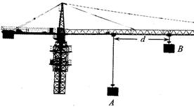 3、计算题 (12分)如图所示,起重机将重物吊运到高处的过程中经过A、B两点,重物的质量m="500" kg,A、B间的水平距离d ="10" m.重物自A点起,沿水平方向做v="1.0" m/s的匀速运动,同时沿竖直方向做初速度为零、加速度a=" 0.2" m/s2的匀加速运动,忽略吊绳的质量及空气阻力,取重力加速度g=" 10" m/s2.求: