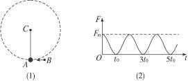 1、简答题 图1-1-1中(1)所示为一根竖直悬挂的不可伸长的轻绳,下端拴一小物块A,上端固定在C点且与一能测量绳的拉力的测力传感器相连.已知有一质量为m0的子弹B沿水平方向以速度v0射入A内(未穿透),接着两者一起绕C点在竖直面内做圆周运动.在各种阻力都可忽略的条件下测力传感器测得绳的拉力F随时间t的变化关系如图1-1-1(2)所示.已知子弹射入的时间极短,且图1-1-1(2)中t=0为A、B开始以相同速度运动的时刻.根据力学规律和题中(包括图)提供的信息,对反映悬挂系统本身性质的物理量(例如A的质量)及A、B一起运动过程中的守恒量,你能求得哪些定量的结果?