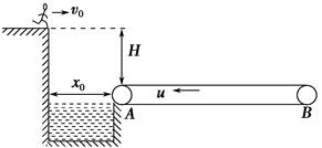 5、计算题 (15分)如图所示,参加电视台娱乐节目,选手要从较高的平台上以水平速度跃出后,落在水平传送带上,已知平台与传送带高度差H=1.8 m,水池宽度x0=1.2 m,传送带A、B间的距离L0=20 m,由于传送带足够粗糙,假设人落到传送带上后瞬间相对传送带静止,经过一个Δt=1.0 s反应时间后,立刻以a=2 m/s2恒定向右加速度跑至传送带最右端.