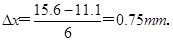 2、实验题 “利用双缝干涉测定光的波长”实验中,双缝间距d=0.4 mm,双缝到光屏的距离L=0.5 m,用某种单色光照射双缝得到干涉条纹如图所示,分划板在图中A、B位置时游标卡尺读数也如图中所示,则: