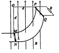3、计算题 (16分)如图所示,用PM、QN是两根半径为d的光滑的圆弧轨道,其间距为L,O、P连线水平,M.N在同一水平高度,圆弧轨道电阻不计,在其上端连有一阻值为R的电阻,整个装置处于竖直向上的匀强磁场中,磁感应强度大小为B。现有一根长度稍大于L、质量为m、电阻为m、电阻为r的金属棒从轨道的顶端P处由静止开始下滑,到达轨道底端MN时对轨道的压力为2mg,求:
