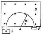 4、计算题 (8分)如图所示是质谱仪示意图,图中离子源S产生电荷量为q的离子,经电压为U的电场加速后,由A点垂直射人磁感应强度为B的有界匀强磁场中,经过半个圆周,打在磁场边界底片上的P点,测得PA=d,求离子的质量m。