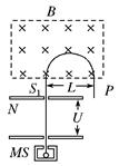 5、填空题 如图所示,离子源S产生质量为m,电荷量为q的离子,离子产生出来的速度很小,要以看做速度为0,产生的离子经过电压U加速后,进入磁感强度为B的一匀强磁场,沿着半圆周运动到达P点,测得P点到入口处S1的距离为L,则 N极板为________极板,此离子荷质比