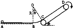 4、简答题 如图所示,光滑圆弧面BC与水平面和传送带分别相切于B、C两处,OC垂直于CD.圆弧所对的圆心角θ=37°,BC圆弧半径R=7m.足够长的传送带以恒定速率v=4m/s顺时针转动,传送带CD与水平面的夹角θ=37°.一质量m=1kg的小滑块从A点以v0=1Om/s的初速度向B点运动,A、B间的距离s=3.6m.小滑块与水平面、传送带之间的动摩擦因数均为u=0.5.重力加速度g=10m/s2,sin37°=0.6,cos37°=0.8.求:
