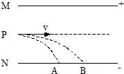 5、选择题 两平行金属板水平放置,如图所示,M板带正电,N板带负电,有A、B两个带正电的微粒以相同的速度,从P点沿水平方向射入电场,经一段时间后,A落在N板上的A点,B落在N板上的B点,重力不计,则( )