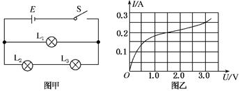 1、选择题  在如图甲所示的电路中,电源的电动势为3.0V,内阻不计,L1、L2、L3为3个用特殊材料制成的同规格的小灯泡,这种小灯泡的伏安特性曲线如图乙所示。当开关S闭合稳定后