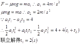5、简答题 在某一水平面的一条直线上,有A、B两物体相距4m。B物体在拉力的作用下向右以4m/s的速度做匀速运动。同一时刻位于B左侧的质量为1Kg的A物体在水平向右大小为6N的恒力F作用下从静止开始运动,恒力作用一段时间后撤去,A与水平面间的动摩擦因数为0.2,若要求A能追上B,则恒力F的作用时间至少为多少(g=10m/s2)