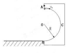 2、计算题 一竖直固定光滑的半圆形轨道ACB,圆心为O,半径为R。在最高点A把小球以平抛,小球碰到轨道后不反弹(沿轨道径向速度减为0),忽略一切阻力,求: