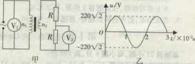 1、选择题  如图甲所示理想变压器的原线圈的匝数n1与副线圈的匝数n2之比为10∶1。原线圈接如图乙所示的正弦交流电,两个阻值均为11Ω的定值电阻串联接在副线圈两端(电压表均为理想电表),则(? )