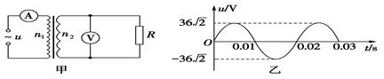 2、计算题  如图所示,甲图为一理想变压器,其原副线圈匝数比n1∶n2=10 ∶1.当原线圈接乙图所示的正弦交流电.副线圈接负载电阻R=10Ω。 电压表、电流表均为理想表。求: