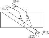 本题解析:如右图所示由折射定律可知两条光线出射后仍与入射光线平行,两条出射光线也平行,由于紫光的折射率大于红光的折射率,故β<α,导致d′<d,故B项正确.