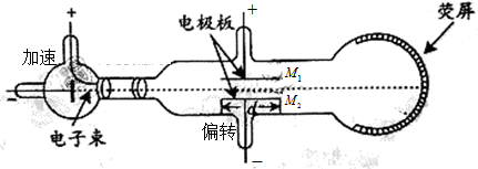 5、选择题 如图所示的阴极射线管,无偏转电场时,电子束加速后打到荧屏中央形成亮斑.如果只逐渐增大M1M2之间的电势差,则
