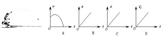 4、选择题  如图所示,某同学斜向上抛出一石块,空气阻力不计。下列关于石块在空中运动过程中的速率v、加速度a、水平方向的位移x和在竖直方向上的速度Vy随时间t变化的图象中,正确的是