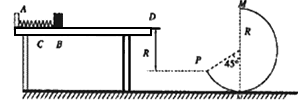 1、计算题 如图所示,水平桌面上有一轻弹簧,左端固定在A点,自然状态时其右端位于B点。D点位于水桌面最右端,水平桌面右侧有一竖直放置的光滑轨道MNP,其形状为半径R=0.8m的圆环剪去左上角135°的圆弧,MN为其竖直直径,P点到桌面的竖直距离为R,P点到桌面右侧边缘的水平距离为2R。用质量m1=0.4kg的物块将弹簧缓慢压缩到C点,释放后弹簧恢复原长时物块恰停止在B点。用同种材料、质量为m2=0.2kg的物块将弹簧缓慢压缩到C点释放,物块过B点后其位移与时间的关系为