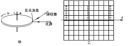 1、填空题 如图甲是利用激光测转速的原理示意图,图中圆盘可绕固定轴转动,盘边缘侧面上有一小段涂有很薄的反光材料,当盘转到某一位置时,接收器可以接收到反光涂层所反射的激光束,并将所收到的光信号立即转变成电信号,在示波器显示屏上显示出来。