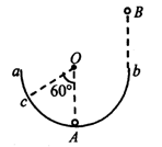 (2)(9分)如图所示,一半径为R的半圆形光滑轨道固定在竖直平面内.a、b是轨道的两端点且高度相同,O为圆心。小球A静止在轨道的最低点,小球B从轨道右端b点的正上方距b点高为2R处由静止自由落下,从b点沿圆弧切线进入轨道后,与小球A相碰。第一次碰撞后B球恰返回到b点,A球上升的最高点为c,Oc连线与竖直方向夹角为60°(两球均可视为质点)。求A、B两球的质量之比mA:mB。(结果可以用根式表示)