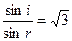2、选择题 如图所示,一条单色光线从空气射入某介质时,若入射角是60°,折射角是30°,则该介质的折射率为( )