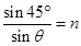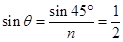 参考答案:解:设光线以45°射到半圆柱的平面上时的折射角为θ,如图所示。