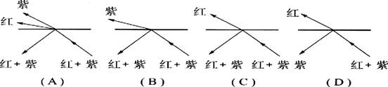 5、选择题 一束红、紫两色的混合光,从某种液体射向空气,当研究在界面上发生的折射和反射现象时. 可能发生的情况是下图中的
