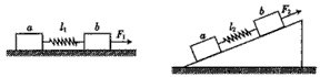 2、选择题 如图所示,一轻弹簧两端分别连接物体a、b。第一种情景:在水平力F1的作用下a、b共同向右匀变速运动,此时弹簧的长度为l1;第二种情景:在沿斜面向上的力F2的作用下a、b共同向上匀变速运动,此时弹簧的长度为l2。若物体a、b与接触面的摩擦因数相同,则轻弹簧的原长为