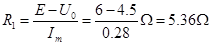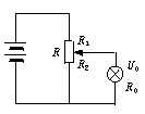 4、计算题  如图所示,用电动势E="6" V,内阻不计的蓄电池组,通过滑线变阻器组成分压电路,向电阻R0="20" Ω,额定电压U0="4.5" V的灯泡供电使它正常发光,试问当电池组对灯泡的供电效率η=60%时,变阻器R的阻值和能承受的最大电流应满足什么要求?