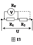 3、简答题  阻值较大的电阻R1和R2串联后,接入电压U恒定的电路,如图13所示,现用同一电压表依次测量R1与R2的电压,测量值分别为U1与U2,已知电压表内阻与R1、R2相差不大,求U1/U2的比值?