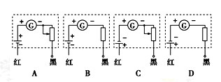 2、选择题 如图所示是一欧姆表(多用电表欧姆挡)的结构示意图,虚线框内有欧姆表的内部电路,红、黑表笔分别插入正、负插孔,虚线框内的欧姆表的内部电路图正确的是( )