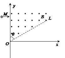 2、计算题 如图所示,虚线OL与y轴的夹角为θ=60°,在此角范围内有垂直于xOy平面向外的匀强磁场,磁感应强度大小为B。一质量为m、电荷量为q(q>0)的粒子从左侧平行于x轴射入磁场,入射点为M。粒子在磁场中运动的轨道半径为R。粒子离开磁场后的运动轨迹与x轴交于P点(图中未画出),且OP=R。不计重力。求M点到O点的距离和粒子在磁场中运动的时间。