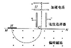 1、填空题 如图所示为质谱仪的原理示意图,电荷量为q、质量为m的带正电的粒子从静止开始经过电势差为U的加速电场后进入粒子速度选择器,选择器中存在相互垂直的匀强电场和匀强磁场,匀强电场的场强为E、方向水平向右.已知带电粒子能够沿直线穿过速度选择器,从G点垂直MN进入偏转磁场,该偏转磁场是一个以直线MN为边界、方向垂直纸面向外的匀强磁场.带电粒子经偏转磁场后,最终到达照相底片的H点.可测量出G、H间的距离为l.带电粒子的重力可忽略不计.粒子速度选择器中匀强磁场的磁感强度B1的大小为??;偏转磁场的磁感强度B2的大小为?。