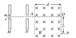 4、计算题 电子自静止开始经M、N板间(两板间的电压为U)的电场加速后从A点垂直于磁场边界射入宽度为d有平行边界的匀强磁场中,电子离开磁场时的位置P偏离入射方向的距离为L,如图所示.求匀强磁场的磁感应强度.(已知电子的质量为m,电荷量为e)、