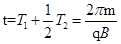 粒子在磁场B1中运动时间为T1,在磁场B2中运动时间为