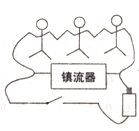 2、填空题 有一个称为“千人震”的趣味物理小实验,实验是用一节电动势为1.5V的新干电池,几根导线、开关和一个用于日光灯上的镇流器来完成。几位做实验的同学手拉手成一串,和电池、镇流器、开关、导线连成图示实验电路,闭合开关,经过一段时间再断开开关,此过程中同学们会有触电的感觉。人有触电感觉发生在开关 (填“接通瞬间”、“断开瞬间”或“一直接通”)时,其原因是 。