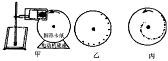 5、实验题 图甲所示为粗略测量某机器转动角速度的实验装置,半径不大的圆形卡纸固定在机器的转轴上,在机器的带动下匀速转动,在圆形卡纸的旁边垂直安装一个改装了的电火花计时器。