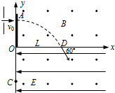 4、简答题  如图所示,在y轴右上方有一匀强磁场,磁感应强度为B,方向垂直纸面向外.在x轴的下方有一匀强电场,场强为E,方向平行x轴向左.有一铅板放置在y轴处且与纸面垂直.现有一质量为m、带电量为q的粒子由静止经过加速电压为U的电场加速,然后以垂直与铅板的方向从A处穿过铅板,而后从x轴的D处以与x轴正方向夹角为60°的方向进入电场和磁场重叠的区域,最后到达y轴上的C点.已知OD长为L,不计重力.求: