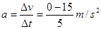 4、选择题 一辆汽车正常行驶时,突然发现前面有行人横穿马路,立即紧急刹车,做匀变速直线运动,在5s内速度从15m/s减小到零,规定刹车时的速度方向为正方向,则汽车的加速度为(?)