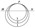 )的径迹.它们在同一平面内沿逆时针方向做匀速圆周运动,三者轨道半径r1>r2>r3并相切于P点,设T、v、a、t分别表示它们做圆周运动的周期、线速度、向心加速度以及各自从经过P点算起到第一次通过图中虚线MN所经历的时间,则? ( )