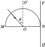 5、简答题 半径为R的固定半圆形玻璃砖的横截面如图所示,O点为圆心,OO′为直径MN的垂线.足够大的光屏PQ紧靠在玻璃砖的右侧且与MN垂直.一束复色光沿半径方向与OO′成θ=30°角射向O点,已知复色光包含有折射率从n1=