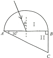 4、计算题 某种光学元件有两种不同透明物质I和透明物质II制成,其横截面积如图所示,O为AB中点,∠BAC=30°,半圆形透明物质I的折射率为